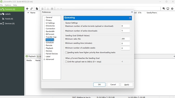 4、进入【queuing】(队列),对于前两个选项,分别是对应“最大活动任务数”和“最大活动下载数”,其数量分别不要超过10、5,以避免下载速度被过多分散。