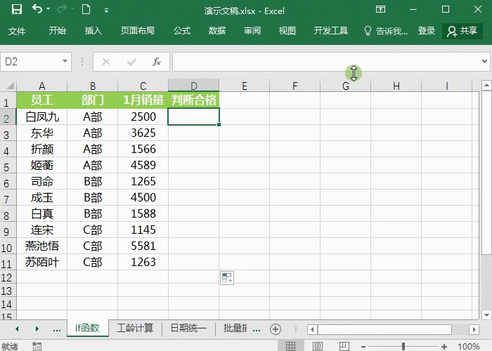 假设需要判断销量是否达标。公式为:=IF(C2>2000,"达标","未达标")。