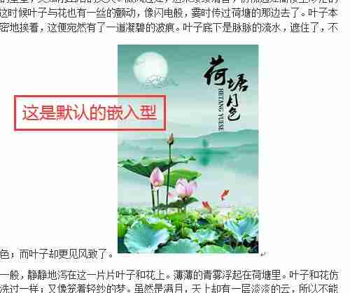(1)嵌入型:这种版式是图片的缺省方式,图片嵌入文本中,可以将图片用为普通文字处理。