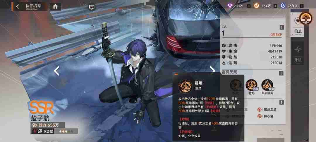 楚子航的核心技能“言灵·君焰”对全体敌人造成高额物理伤害并附带灼烧效果。然而,灼烧效果易被净化,在当前快节奏战斗中,单纯依靠灼烧打输出的策略效率低下。
