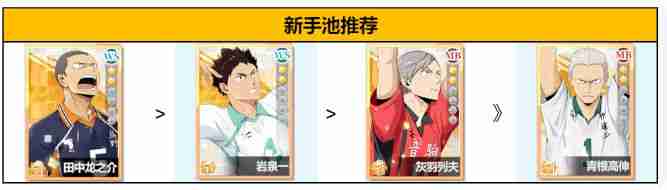 新手池提供田中龙之介、岩泉一、灰羽列夫、青根高伸四位SSR角色,可重置5次抽卡结果。推荐优先级:田中龙之介 > 岩泉一 > 灰羽列夫 > 青根高伸。田中龙之介不仅能融入当前版本强势的乌野体系,其强攻型输出也更适合新手开荒。