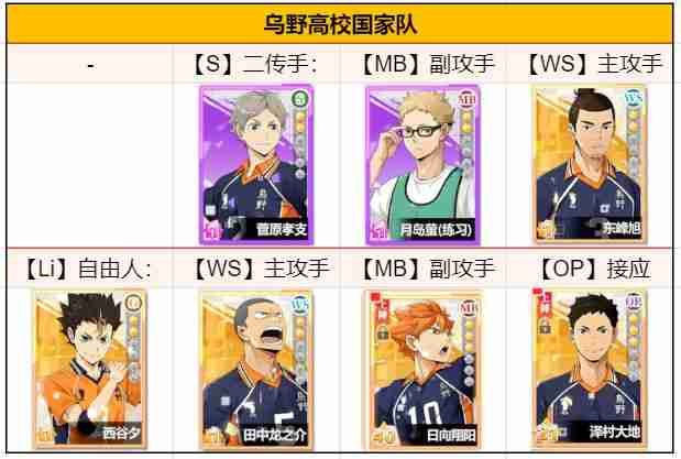 乌野低配队为全SR阵容,适合前期过渡,后期可作为培养素材。