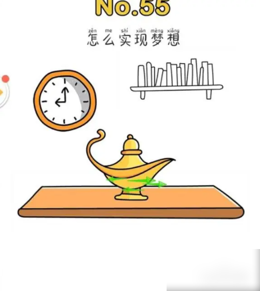 进入脑洞大师第55关。 摩擦神灯。 点击出现的“梦想”选项。 点击阿拉丁身后书架上颜色变深的书。