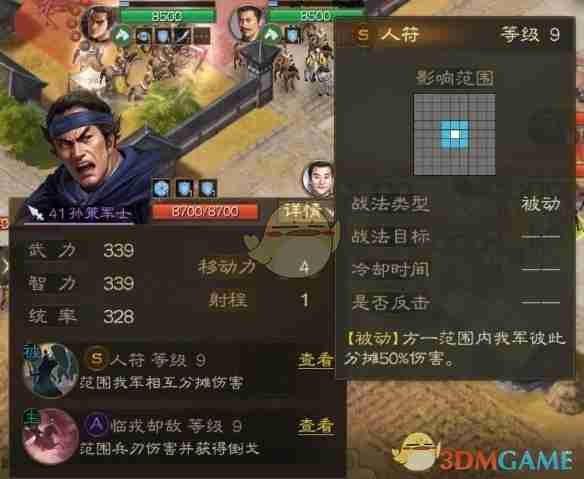 首先是人符军士,会让方形一格范围的单位彼此分摊50%伤害,包括百姓都会分摊到这个伤害。