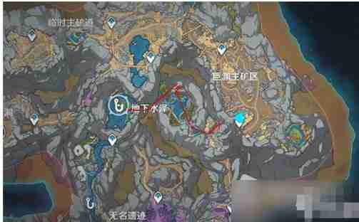 层岩巨渊地下矿区钓鱼点所在位置及前往方法分享:1、首先传送到巨渊主矿区的这个传送锚点处,后续的路线如下图所示。
