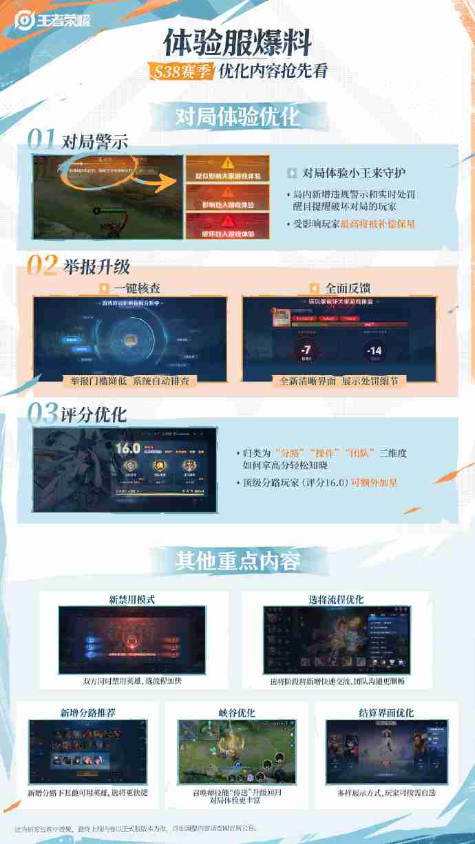 王者荣耀s38赛季体验服更新上线,全新功能等你体验!本次更新重点关注游戏公平性,对局内举报和处罚机制进行了全面升级。