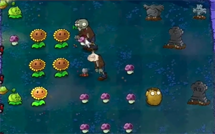 初期布阵:: 在右侧种植三个小喷菇,左侧种植一个向日葵,建立初期防御和阳光供应。