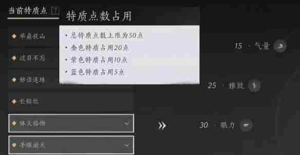 2、前期可以根据以上的图表来选择对应的特质,前期推荐多加眼力、体魄、雅致;
