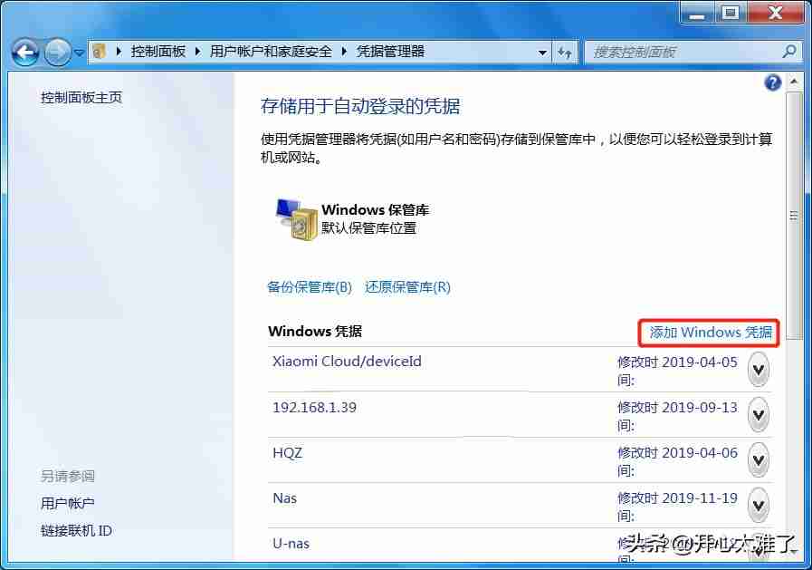 点击“添加windows凭证”。我这个电脑里面的东西有点多,一般电脑里面是没有的。