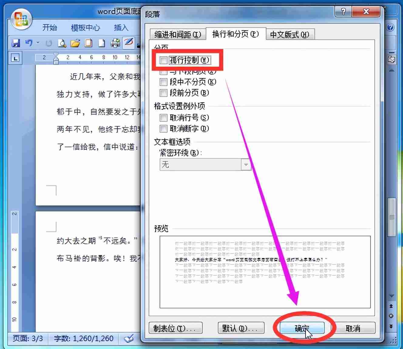 点击[孤行控制]然后在弹出的段落窗口里面,点击换行和分页选项卡下面的“孤行控制”选项,使其前面的对勾去掉;
