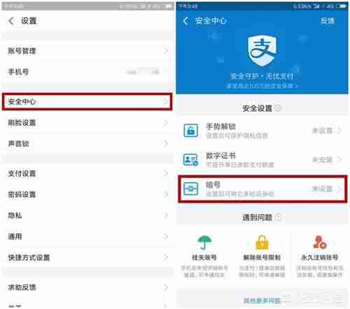 ①在“设置—安全中心”中,找到“暗号”功能。
